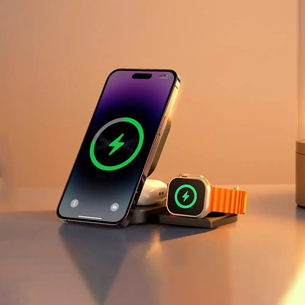 Power up all your devices in one place with the PortaMag Trio. It's neat, compact, and perfect for keeping your iPhone, Apple Watch, and AirPods charged and ready. Easy to carry and stylish, it fits into any setting, at home or away