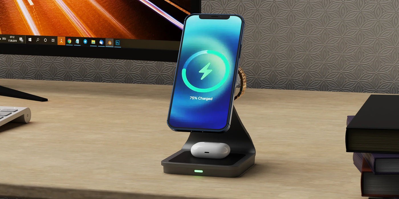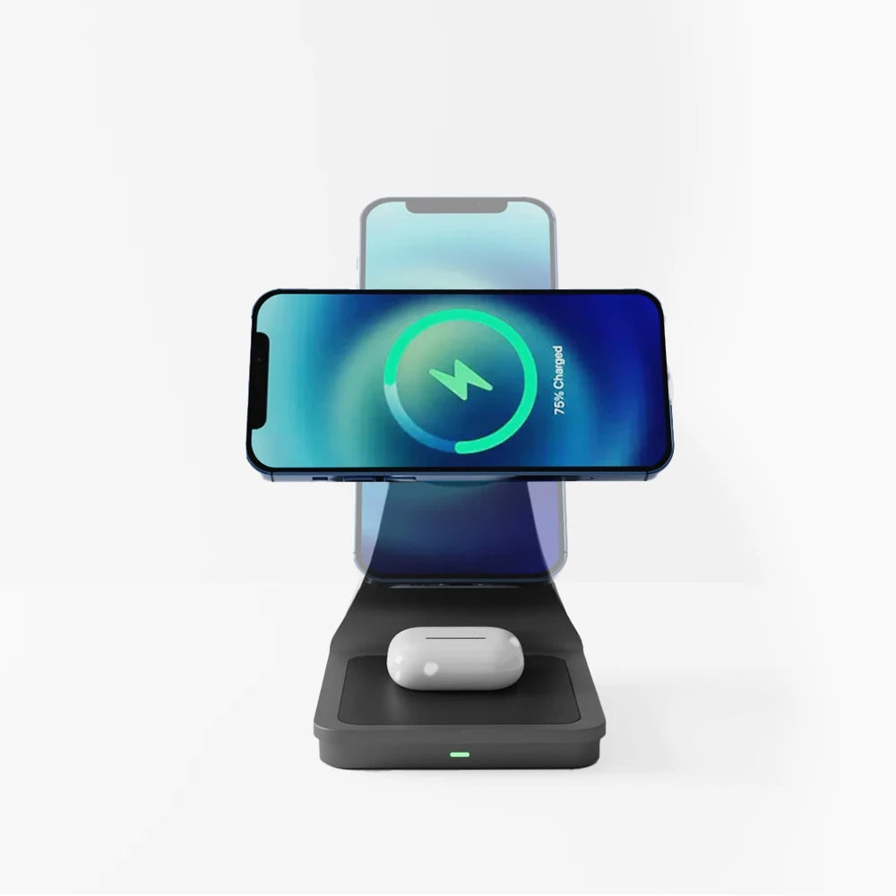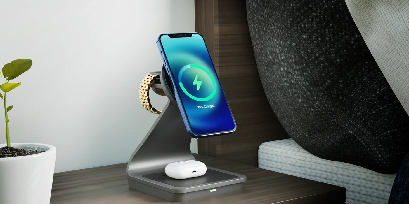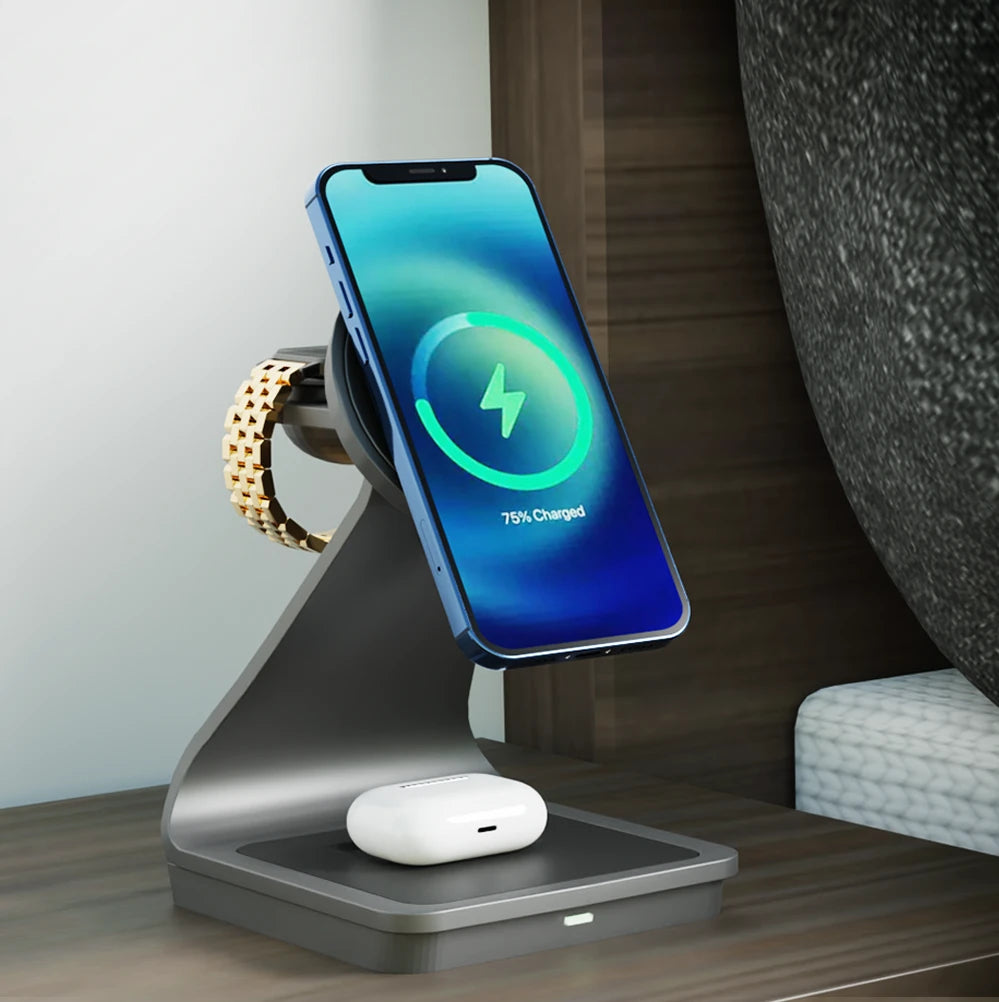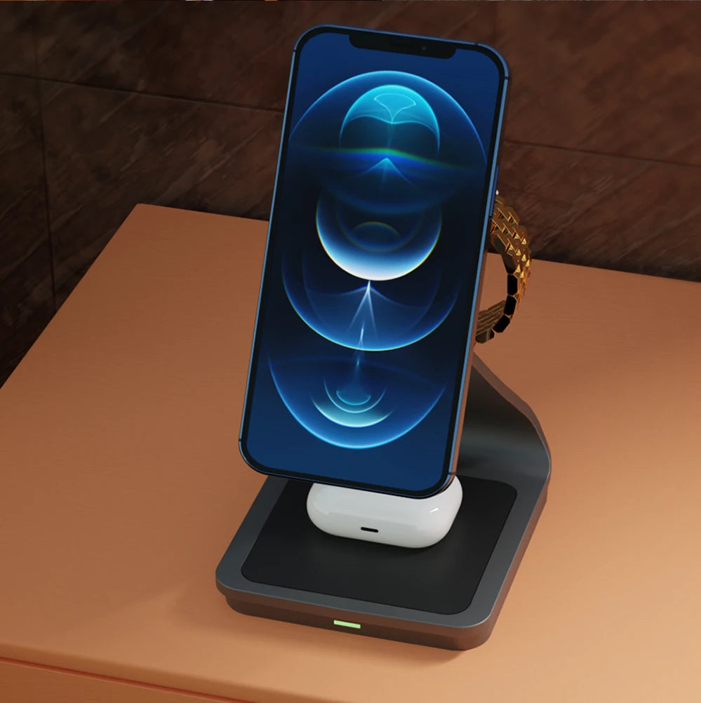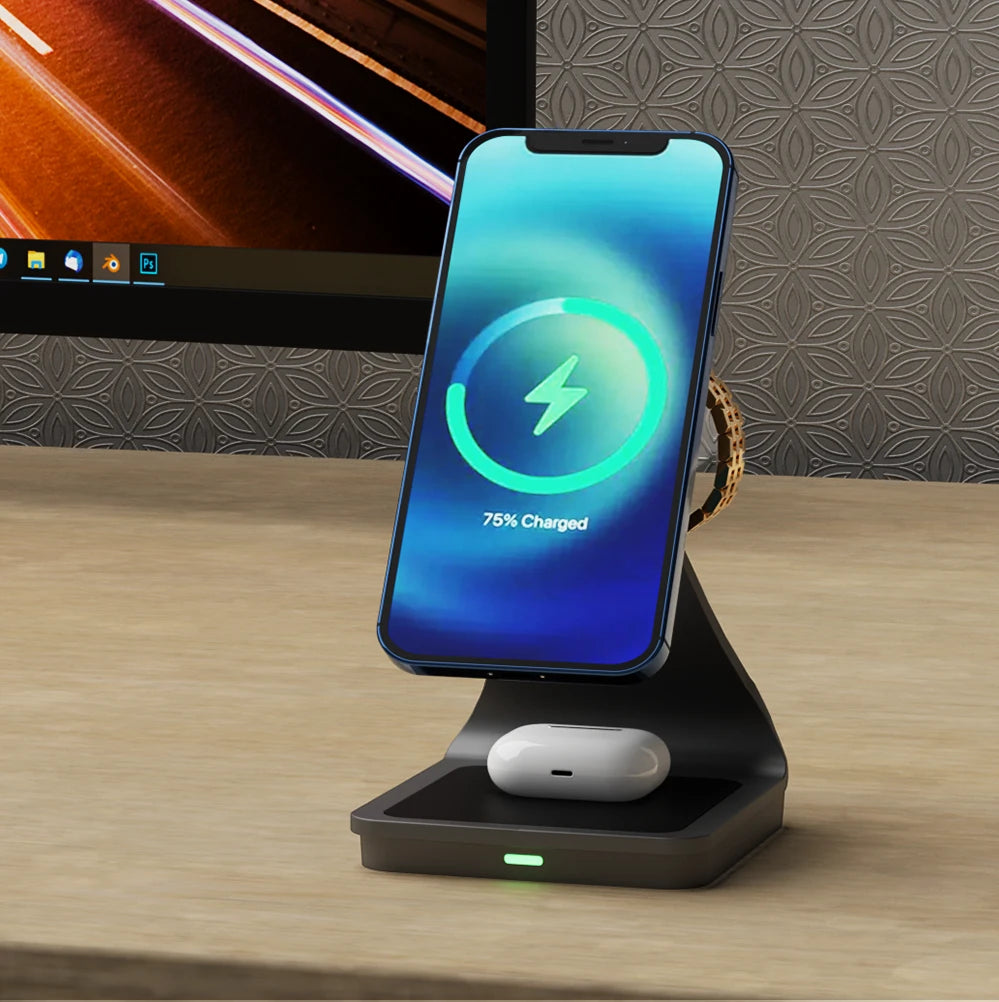 Charge all of your devices at once. This compact and sleek stand is the perfect way to keep your Apple Watch, AirPods, and iPhone in sight while you charge. With Magsafe Fast Wireless Charging Stand, you can power up all of your Apple devices with greater convenience.