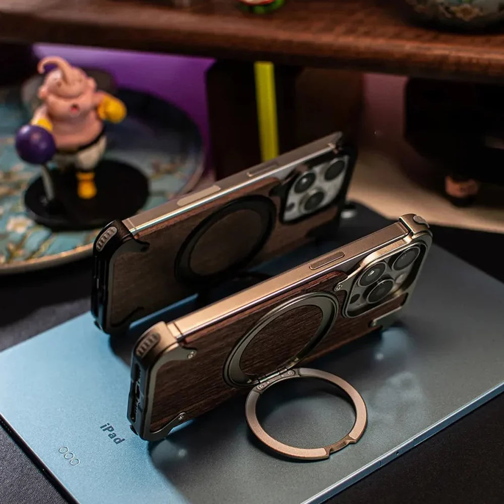 Protect your iPhone with premium aluminum alloy and walnut wood accents, offering robust defense against bumps, drops, and scratches.