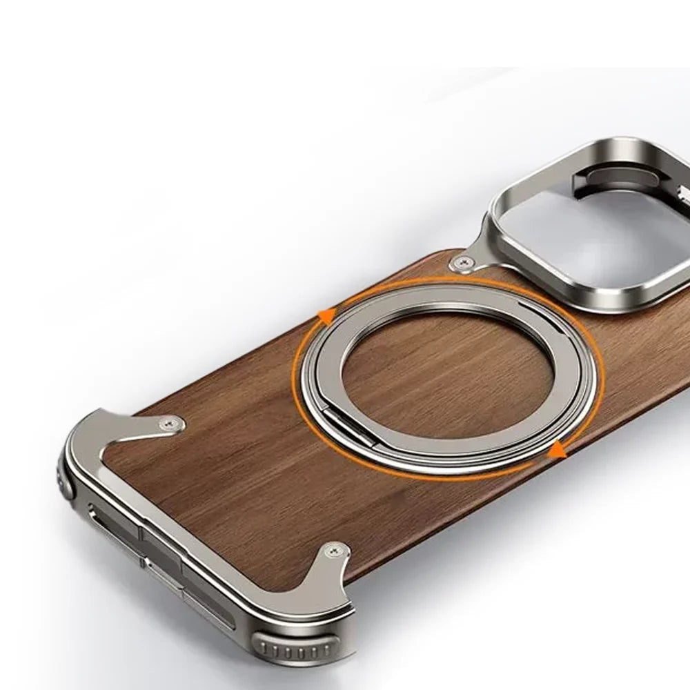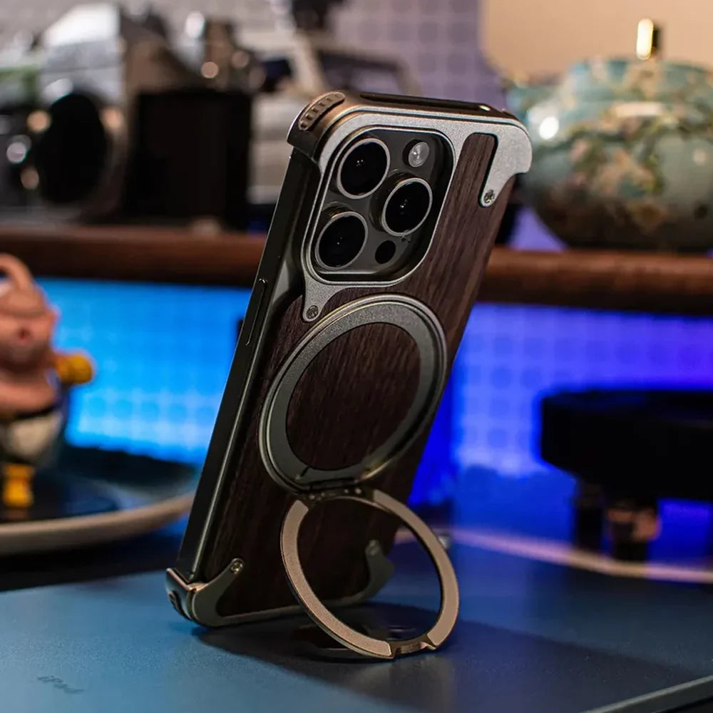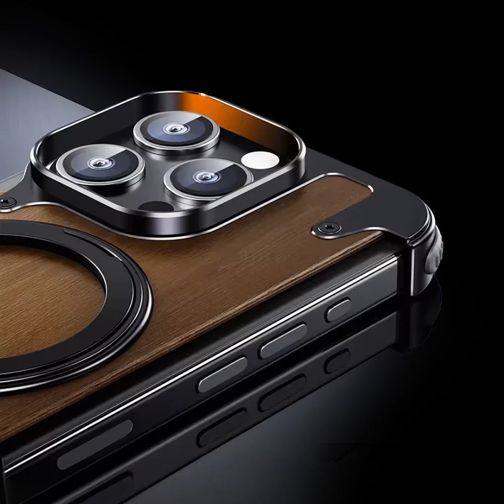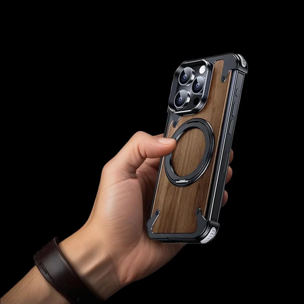 Protect your iPhone with premium aluminum alloy and walnut wood accents, offering robust defense against bumps, drops, and scratches.