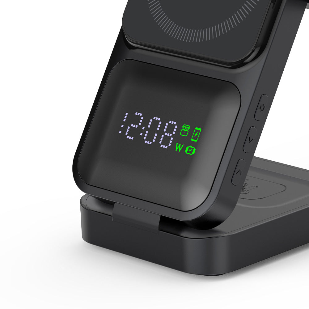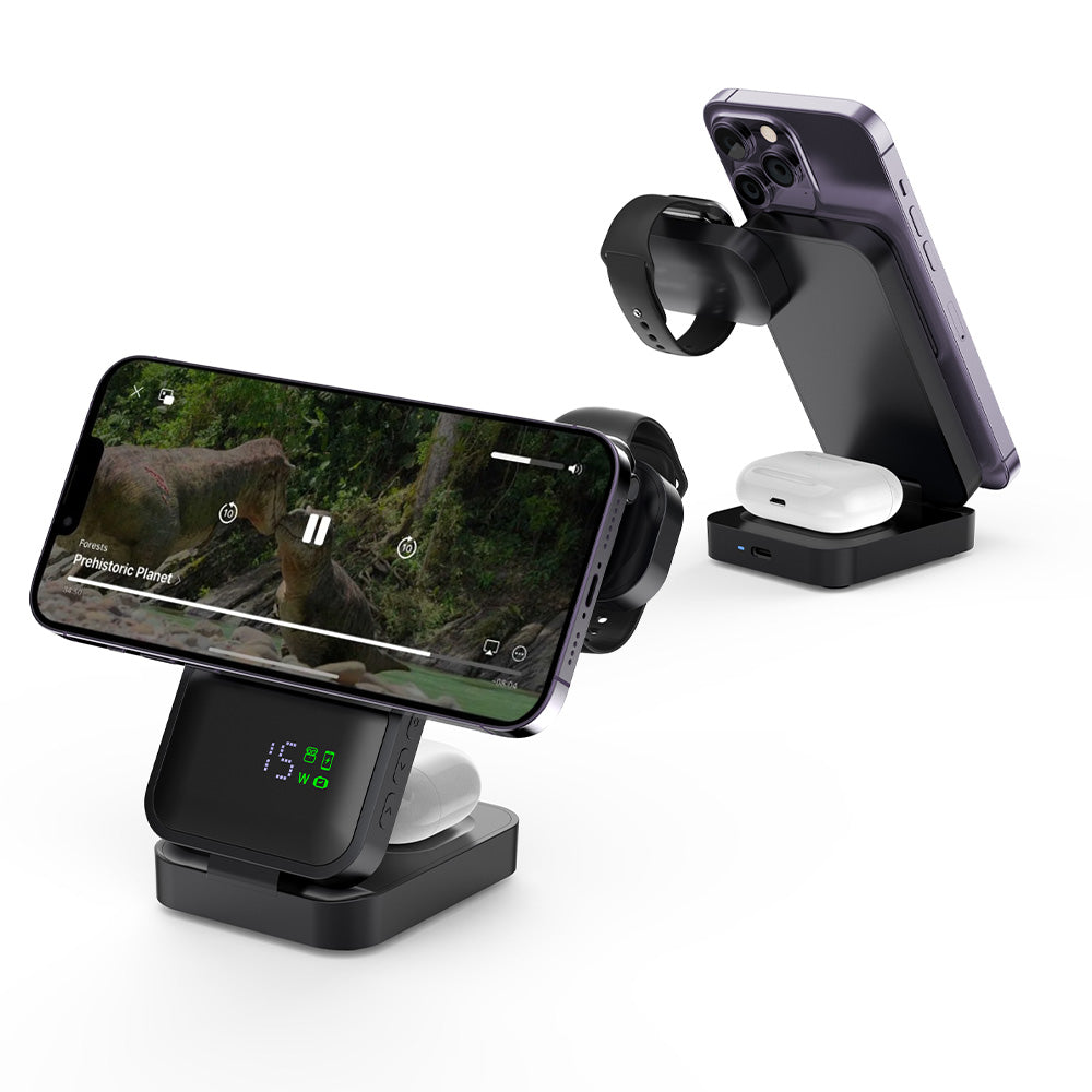• The MagNova 3-in-1 Wireless Charger is designed to make your life easier by combining convenience, functionality, and style. It allows you to charge your iPhone, Apple Watch, and AirPods all at once, eliminating the need for multiple chargers and keeping your space clean and organized. The foldable and adjustable design makes it compact and portable, perfect for travel or use at home. You can easily switch between horizontal and vertical modes, making it ideal for watching videos, working, or simply keeping your devices within reach. Additionally, the built-in time display feature allows you to keep track of time at a glance, adding even more practicality to your charging setup. With its sleek design and practical features, the MagNova 3-in-1 Wireless Charger simplifies your daily routine and keeps your devices powered up wherever you go.