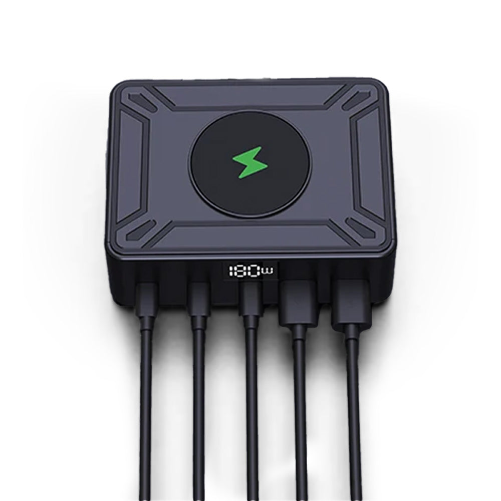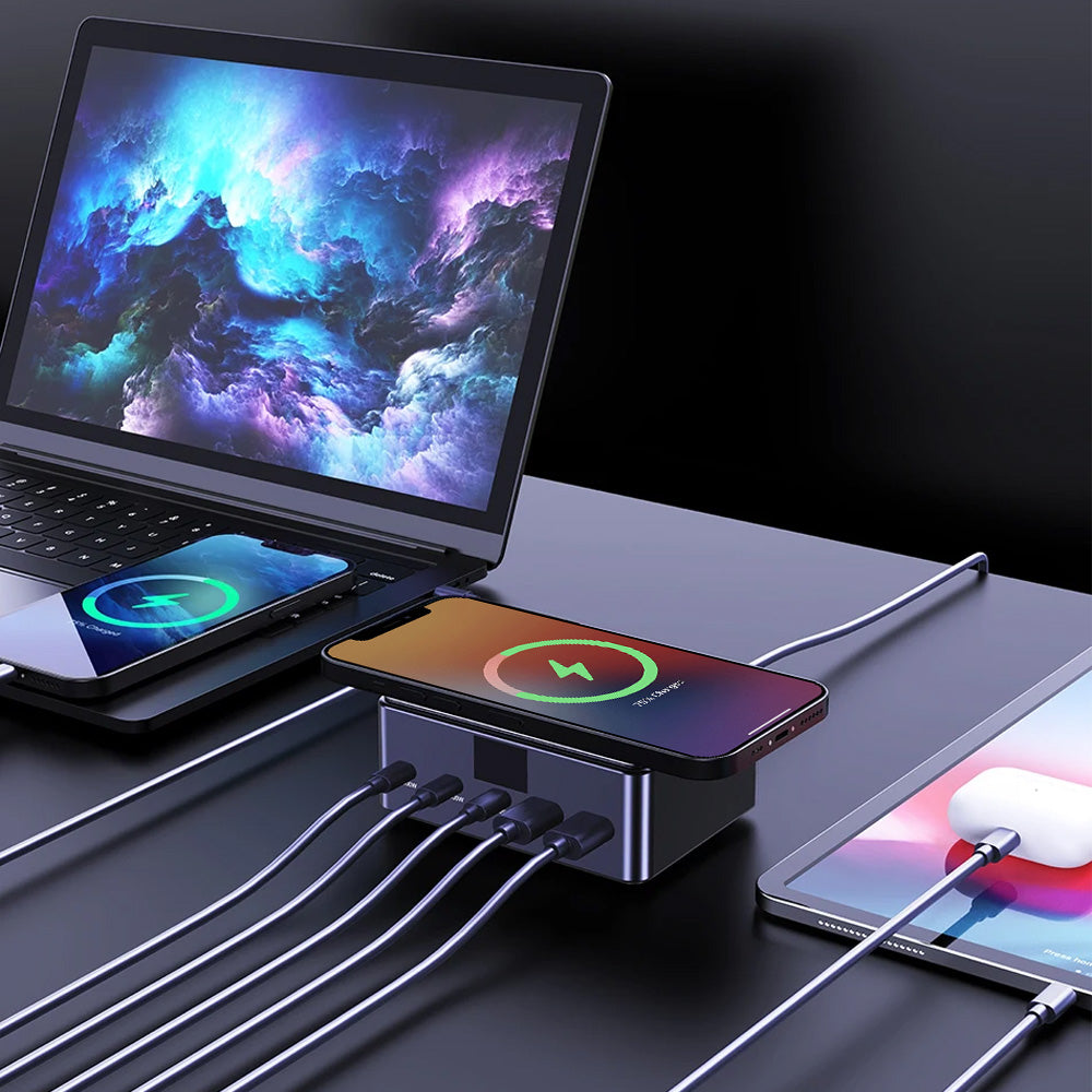 Six ports, wireless charging, and 190W of smart power distribution charge your laptop, tablet, phone, and more all at once without slowing down.