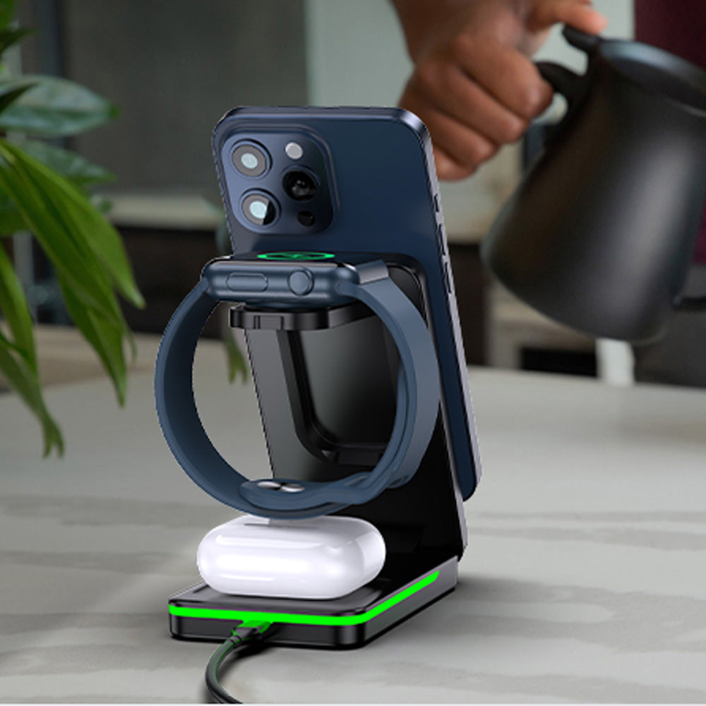 Declutter with a charger that powers it all and lights up your desk or nightstand with vibrant RGB hues